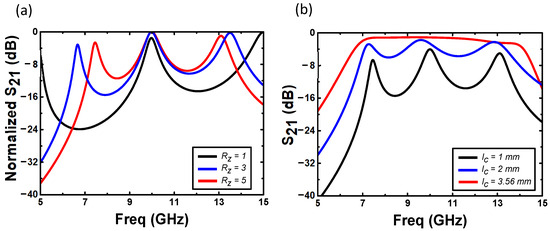 Figure 7. (a) Simulated S21 for various impedance ratios Rz of the SIR under weak coupling conditions. (b) Simulated S21 with varying parallel-coupled line length lc at fixed Rz of 5.