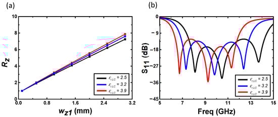 Figure 8. (a) Calculated impedance ratio Rz as a function of wz1 for different values of εr,LC (2.5, 3.2, 3.9), based on (1)–(11). (b) Simulated S11 responses of the SIR for the same permittivity values using full-wave analysis at fixed Rz of 5. In both cases, wz2 was fixed at 0.1 mm, and the LC gap thickness was set to 200 μm.