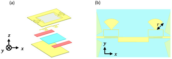 Figure 9. (a) Overall structure of the wideband BPF. (b) The proposed SIR structure with capacitive-ended coupled lines filled with LCs.