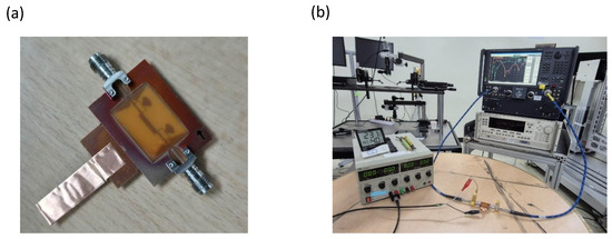 The overall structure used for sample measurement is as follows. Two substrates were employed: the upper substrate includes a grounded coplanar waveguide (GCPW) for connector feeding, an IMSL pattern for realizing the tunable wideband filter within the LC region, and vias for connecting the top and bottom electrodes. The lower substrate serves as the ground plane for both the IMSL and the biasing signal. An adhesive tape was used between the two substrates to maintain a consistent cell gap, and the liquid crystal was filled via capillary action (Figure 9a).