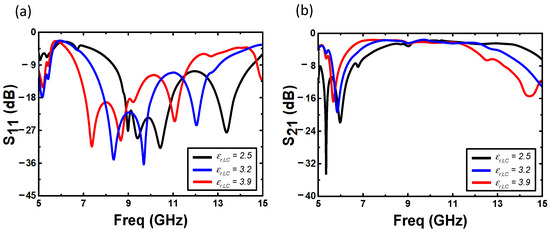 Figure 11. (a) Simulated S11 dependency. (b) Simulated S21 dependency of the proposed structure for several values of εr,LC.