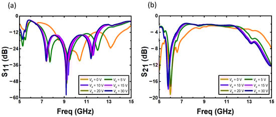 Figure 14 presents the frequency responses at VB = 0 and 30 V, respectively. The measured S11 and S21 show good agreement with the simulation results, where the LC was treated as an anisotropic material. Table 2 summarizes the experimental results of the proposed structure at 0 and 30 V. Through the additional measurement using separately fabricated samples, it was confirmed that all deviations remained within 0.1 dB (insertion loss), 1% (FBW), and 0.1 GHz (f0) regardless of the applied voltage, thereby supporting the high reliability of the measurement results presented in this work.