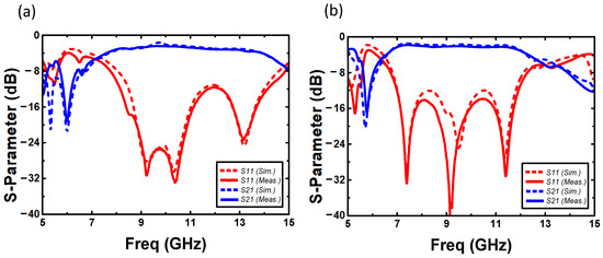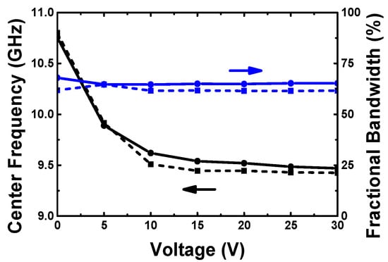 To quantitatively compare the simulation and measurement data, the variations in f0 and the 3 dB FBW were plotted (Figure 13). In the simulation, f0 was tuned from 10.80 to 9.43 GHz, the FBW ranged from 61.51% to 64.65%, and the tuning range was expected to be 13.60%. In the measurements, f0 was adjusted from 10.76 to 9.47 GHz, the FBW varied from 67.97% to 64.66%, and the tuning range was observed to be 12.71%. The maximum difference in f0 between simulation and measurement was within 0.11 GHz at each voltage, and the FBW exceeded 60% in both cases. The tuning range discrepancy of less than 1% indicates that the dielectric properties of the LCs were reliably characterized. Moreover, this comparison confirms that the measurement data closely aligned with the simulation results.