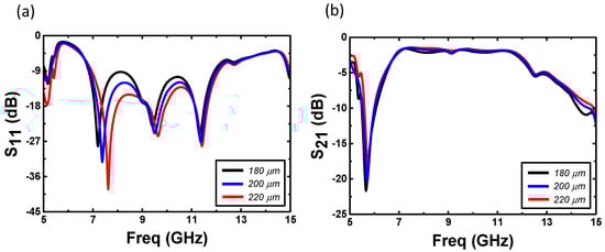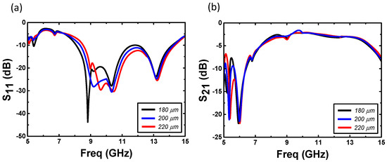 For sensitivity analysis, we conducted simulations by applying a ±10% variation in the LC cell thickness based on the target value of 200 μm used in the proposed structure. As shown in Figure 15 and Figure 16, despite a ±10% variation in the cell thickness of around 200 μm, the filter maintains similar frequency response characteristics in terms of S21. In the case of S11, as the LC cell thickness decreases, the transmission pole frequency exhibits a downward shift in frequency. This tendency can be reasonably explained.