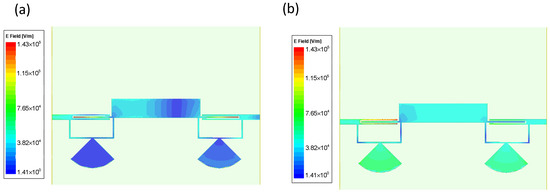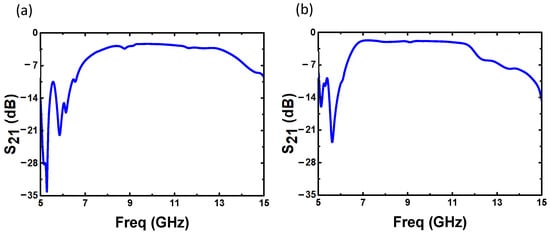 As shown in Figure 14, the proposed design successfully implements a voltage-controlled frequency-reconfigurable wideband bandpass filter. However, an undesired narrow passband in the out-of-band range (5 to 5.4 GHz) was persistently observed regardless of the VB. This spurious response originates from a parasitic low-frequency leakage path formed by the direct connection between the SIR and the coupled line for operating LCs. At 10 GHz, although the transmission line physically connects the resonator, the radial stub effectively blocks the signal path as intended, and most of the signal is observed to propagate through the resonators (Figure 17a). At 5 GHz, however, as previously noted, the SIR resonator does not satisfy the resonance condition, and thus a stopband response was expected. Nevertheless, the radial stub fails to sufficiently suppress the signal, resulting in unintended signal transmission through the direct connection rather than through the resonator (Figure 17b). Although radial stubs are commonly employed as wideband bandstop elements, they inherently exhibit limited rejection uniformity across all frequencies. As the operating frequency deviates from the target rejection frequency, the rejection performance diminishes, leading to residual signal transmission through the connecting line.