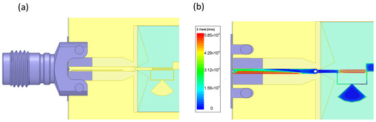 Since the undesired narrow passband appeared consistently over the VB conditions, it can be mitigated in future designs through the inclusion of notch or stopband elements, which can eliminate the unwanted mode without compromising the main tunable passband. To suppress the parasitic passband near 5 GHz without modifying the proposed filter structure, a spurline notch filter can be implemented near the connector interface (Figure 18a). As shown in the E-field distribution at 5 GHz, most of the signal energy is concentrated around the spurline region, effectively blocking the transmission before the signal reaches the SIR structure (Figure 18b). The simulated frequency response with the spurline notch filter confirms that, since the notch element is implemented outside the LC region, it maintains stable rejection characteristics near f0 = 5.10~5.13 GHz regardless of the applied bias voltage (Figure 19). These results demonstrate the feasibility of a reconfigurable wideband bandpass filter with successful suppression of the undesired parasitic passband.