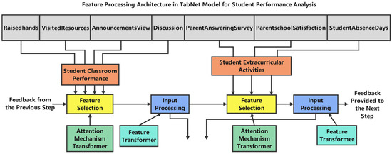As shown in Figure 3, the TabNet architecture processes student performance features through several sequential steps. The model groups input features into two main categories: Student Classroom Performance (including Raisedhands, VisitedResources, AnnouncementsView, and Discussion) and Student Extracurricular Activities (including ParentAnsweringSurvey, ParentschoolSatisfaction, and StudentAbsenceDays).