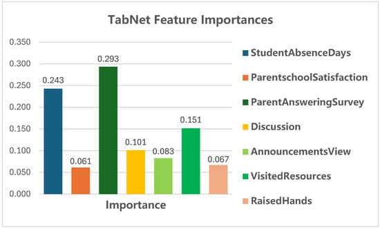 Figure 5 shows that VisitedResources (r = 0.68), Raisedhands (r = 0.65), and AnnouncementsView (r = 0.53) are strongly positively correlated with academic performance. In contrast, Discussion has a lower correlation coefficient (r = 0.31). This suggests that its high importance score in the TabNet model (0.101) may not generalize beyond the training data or may reflect interaction effects with other features (see Section 4.2.3). Additionally, StudentAbsenceDays shows a strong negative correlation (r = −0.67). This aligns with pedagogical expectations that higher absenteeism leads to poorer performance.