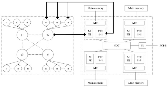 “Sunway TaihuLight” is China’s first supercomputer that completely uses domestic processors, which won first place in the top 500 supercomputers four times between 2016 and 2017 [19]. Its core component, the SW26010 processor, adopts a heterogeneous many-core architecture. Each processor has 260 cores and is divided into four core groups. The core groups are interconnected through a network-on-chip (NOC) and integrate a system interface (SI) bus, which connects to standard PCIe interfaces for direct connection and interconnection between chips [20,21]. Each core group comprises a management processing element (MPE), a memory controller unit (MC), 8 GB of memory, and 64 computation processing element cores (computing processing elements, CPEs) arranged in an 8 × 8 array. The MPE is primarily responsible for task management and scheduling, whereas the CPEs perform intensive computing tasks [22]. Each SW26010 processor is equipped with 32 GB of memory, with each core group containing 8 GB of memory [23]. Each slave core has 64 KB of local data memory (LDM) [24] that functions as a user-controlled cache. The slave core can be executed by the global load/store instructions (gld/gst) [25] and use direct memory access (DMA) to access the main memory [26]. This special design improves performance but also poses programming challenges. Effectively dividing tasks and data to fully utilize the computational efficiency of slave cores is the key to improving performance.