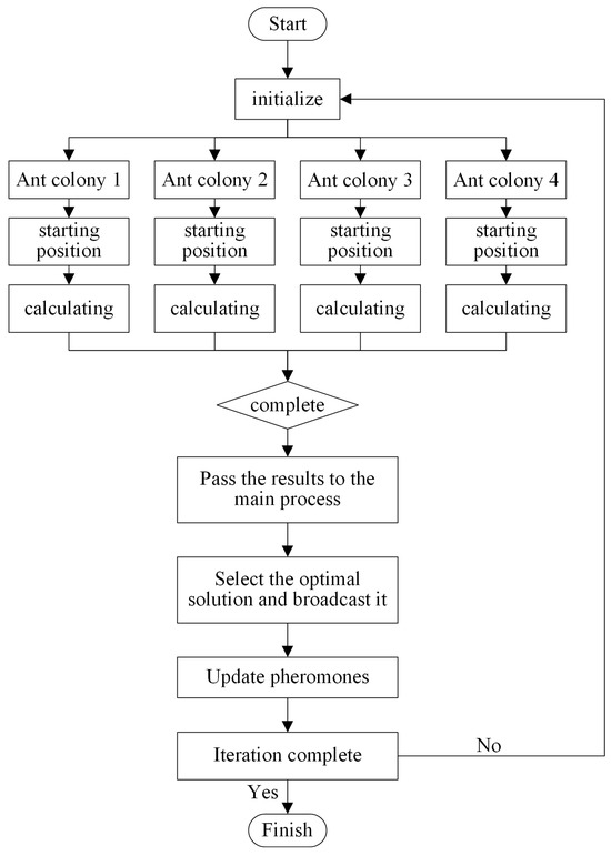 Within one-level parallelism mode, the main core executes parallel tasks, whereas the MPI facilitates interprocess communication. A master core-based parallel ACO (parallel ant colony optimization, PACO) was designed as shown in Algorithm 1. Each MPI process controls a subset of ant colonies, with the number of ants typically evenly distributed among each processing core. Each process runs independently and executes its own ant colony search task in parallel, periodically exchanging pheromone information through MPI communication to prevent any single process from becoming trapped in a local optimal solution. Specifically, each process maintains an independent pheromone matrix. After each iteration, each process sends the locally discovered optimal solution to the main process, which then broadcasts the optimal solution after comparison to guide the update of the global pheromones. Figure 2 illustrates the specific execution workflow of PACO.