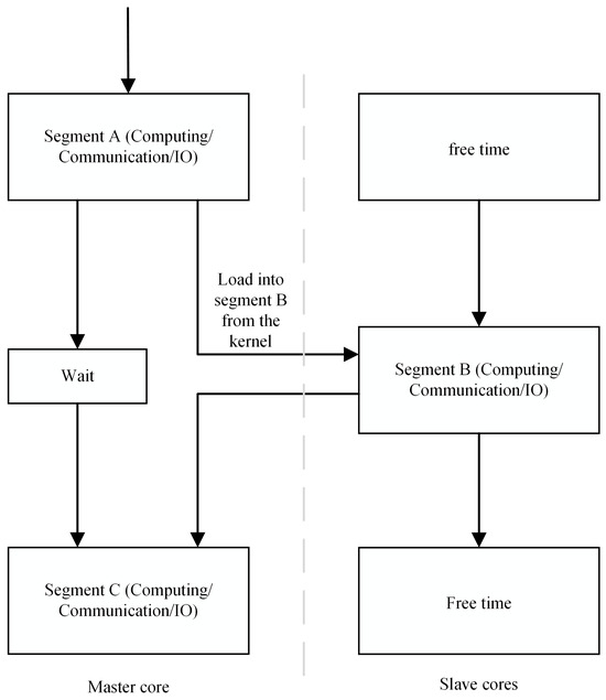 Within the secondary parallel mode, the Sunway many-core processors adopt the island master–slave mode, which relies on the cooperation between the master core and the slave cores to execute computational tasks. Under this paradigm, the ant colony is partitioned into several subpopulations, with each subpopulation corresponding to an “island”, where the master–slave acceleration parallel mode paradigm is applied. In this structure, the master core is responsible for processing the portion of the task that cannot be executed in parallel by the slave cores, including control and communication operations, whereas the slave cores perform specific computational tasks. While a slave core is executing the computational task, the master core remains in a waiting state, as shown in Figure 3.