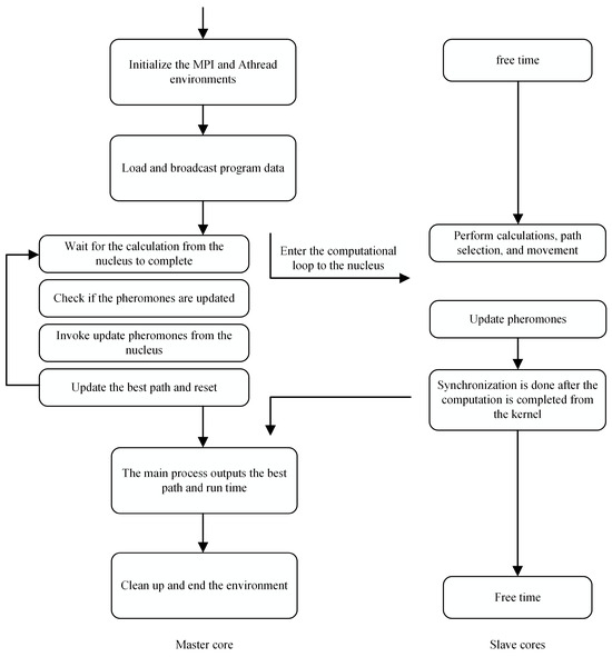 The second level pertains to thread-level parallelism. The accelerated thread library (Athread library) of the Sunway processor is a program acceleration library designed for the two-level parallel programming model (master–slave accelerated programming model) to enhance user convenience and speed. It flexibly controls and schedules the threads within the core group to improve the acceleration performance of the concurrent execution across multiple cores in the core group. The parallelism among the slave cores is achieved through the unique thread library of the Sunway processor, which fully leverages the acceleration capabilities of the slave cores and enables the hybrid parallelism of the ant colony algorithm. The secondary parallel master core and the slave core use the MPI+Athread hybrid programming model.