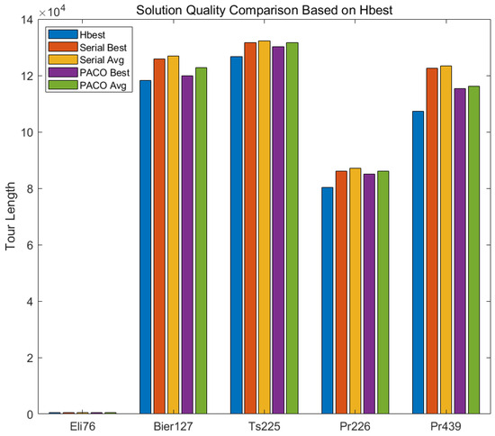 Figure 5 presents a comparison of solution quality between the serial ant colony algorithm (ACO) and the parallel ant colony optimization (PACO) across five TSP datasets: Eli76, Bier127, Ts225, Pr226, and Pr439. The blue bars represent the theoretical optimal solutions (Hbest) and serve as reference benchmarks. The orange and yellow bars correspond to the best and average solutions obtained by the serial ACO, while the purple and green bars represent the best and average solutions achieved by PACO. As shown in the figure, for the small-scale dataset Eli76, both algorithms yield solutions close to Hbest. However, as the problem scale increases—such as in the Bier127 and Ts225 datasets—the best and average solutions from the serial ACO begin to deviate from Hbest, indicating a decline in its search performance. In contrast, PACO maintains smaller deviations and more stable solutions for these medium-sized problems.The difference becomes even more pronounced in the larger datasets Pr226 and Pr439. The serial ACO shows significantly higher deviation from Hbest, while PACO consistently produces solutions that are much closer to the theoretical optimum. Especially in large-scale scenarios, PACO not only improves solution quality but also significantly reduces computation time.