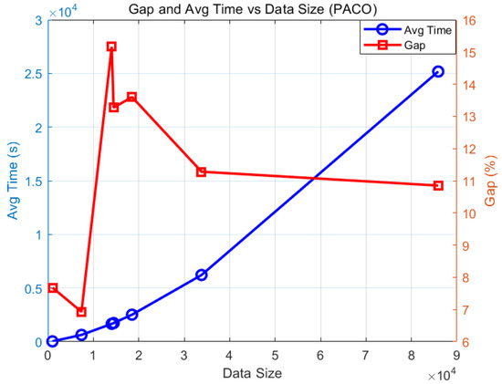 Overall, as the dataset size increases, the PACO algorithm faces growing challenges in maintaining high solution quality, especially in large-scale or asymmetric instances where performance tends to fluctuate more significantly. Concurrently, the running time significantly increases with larger dataset sizes, and the general trend is positively correlated with the amount of data. For instance, when the dataset increased from 1002 to 7397, the running time increased by approximately 1905.64%, and when the dataset increased from 7397 to 14,051, the running time increased by approximately 161.80%. Although the increase was only 4.41% for some medium-sized datasets (such as 14,051–14,461), the running time increased significantly again for larger-scale datasets (such as 33,810–855,900), with an increase of approximately 304.97%.
