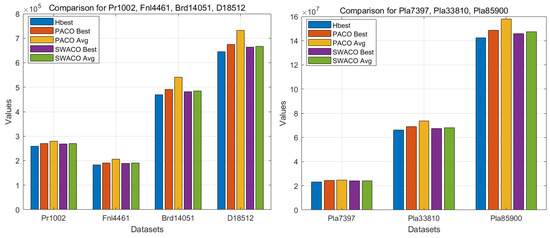 Since the results of the Pr1002, Fnl4461, Brd14051, and D18512 datasets are not on the same scale as those of the other three datasets, the comparison of the Best and AVG values of the PACO and SWACO algorithms will be presented using two separate bar charts. A comparison of the results in Figure 8 shows that, compared with the PACO algorithm, the SWACO algorithm demonstrates higher solution quality, especially in a multicore environment. The SWACO algorithm can make full use of the advantages of multicore parallel computing to improve the efficiency of large-scale problems.