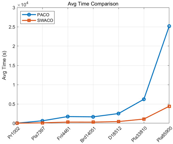 Table 4 shows that as the amount of data increases, the quality of the PACO algorithm’s solution significantly decreases, whereas the running time gradually increases. For the very large-scale datasets, Pla7397, D18512, Pla33810, and Pla85900, the gap between the solution quality of the PACO algorithm and the historical optimal solution (the difference between Avg and Hbest) became more pronounced. For large-scale datasets, such as Pla33810 and Pla85900, the running time of the PACO algorithm approaches two hours or even longer. In particular, for the Brd14051 and Fnl4461 datasets, the gap reached 15.16% and 13.27%, respectively.