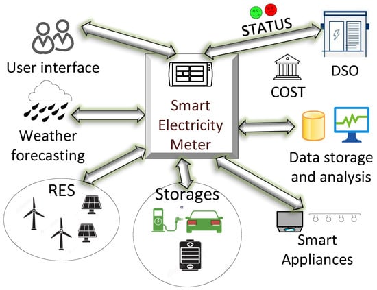 In summary, smart energy meters provide the ability to monitor the flow of electricity in HEMSs. For example, they can determine when energy was supplied from RESs. The DSO can determine the energy consumption profile for each household. This functionality is available due to the logging of data on consumption of electric energy, voltage levels, current, and power factor. Two-way communication between CESs and HEMSs is possible due to the use of AMI. Smart energy meters from individual HEMSs will be part of a distributed control system [33].