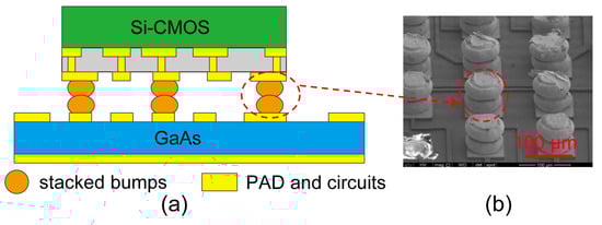 (a) A block diagram of the designed multifunction chip; it contains an RF circuit realized by the GaAs process and a digital circuit realized by Si-CMOS. Flip chips with stacked gold bumps are utilized for 3D heterogeneous integration. (b) A picture of the stacked bumps which provide mechanical and electrical connections between the RF chip and the digital chip.