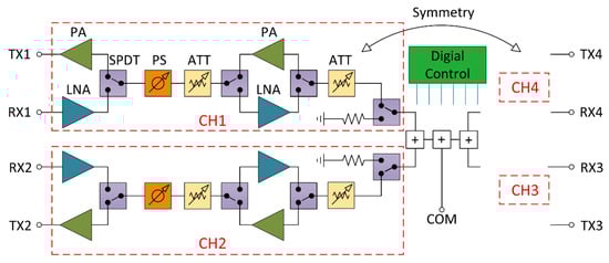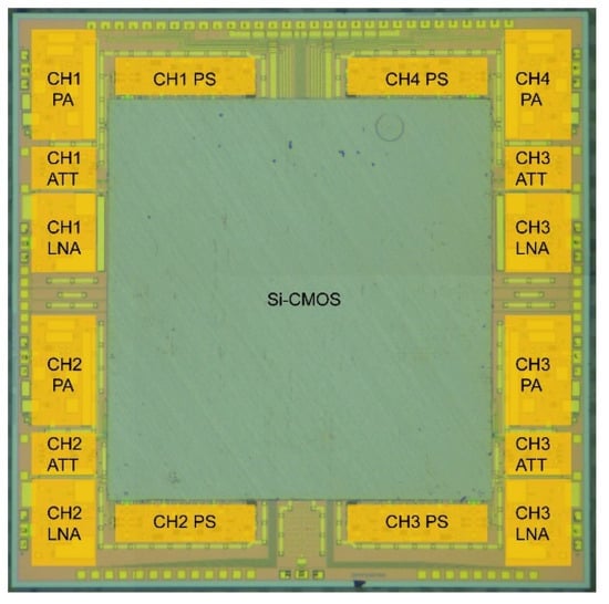 The four channels of transmission (TX) and reception (RX). The sub-circuits in a single channel contain a power divider, digitally controlled phase shifter (PS), digitally controlled attenuator (ATT), low-noise amplifier (LNA), power amplifier (PA), and single-pole double-throw (SPDT) switch. The circuit topology of channels 3 and 4 is symmetrical to the circuit topology of channels 1 and 2. The digital control part in the Si-CMOS chip enables serial-to-parallel conversion, power-on reset, power-off circuit protection, negative voltage outputs, and other functions.