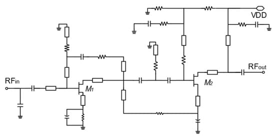 The topology of the power amplifier (PA) for the TX channel is shown in Figure 4. To meet power efficiency requirements, the proposed design adopts a two-stage current-reuse structure, which enhances gain and power efficiency while minimizing overall power consumption. In the first stage, is provided a self-biased circuit for the required gate bias voltage, ensuring its stable operation across varying process and temperature conditions. During the second stage, is powered through a positive power supply voltage divider, which sets the gate and drain voltages for optimal performance. The source voltage of is used to bias the drain of , enabling efficient current reuse and reducing circuit power consumption. In the circuit design phase, appropriate loss and negative feedback are introduced to maintain sufficient amplifier gain and while ensuring absolute stability over the 5–18 GHz frequency range.