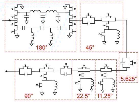 To enhance stability and minimize mismatch effects, the smaller phase shift units (5.625°, 11.25°, and 22.5°), which are more sensitive to impedance mismatches, are positioned in the middle of the cascaded phase shifter network. Meanwhile, the larger phase shift units (45°, 90°, and 180°), which exhibit a stronger mismatch tolerance, are placed at both ends of the cascaded structure.