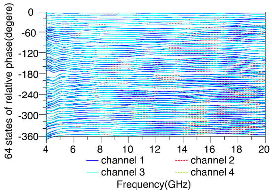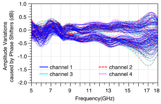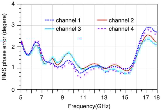 The measured results for all 64 states of the phase shift are shown in Figure 6, which shows that the phase shift in the four channels covers 0 to 354.375° with a step of 5.625°. Phase shift accuracy is a critical parameter in the phased array, as it directly impacts beamforming precision. The measured root mean square (RMS) phase errors of the four channels are shown in Figure 7, which shows that the RMS phase error is lower than 2.5° over the frequency from 5 GHz to 16.5 GHz and lower than 3° at 16.5–18 GHz. Figure 8 shows the measured results of the amplitude variations caused by phase shifting, which shows that the corresponding amplitude variations are within ±0.8 dB at the frequency band of 5–16 GHz, and within ±1.5 dB from 16 to 18 GHz. The performance of the phase shifter degrades at 16–18 GHz. The increased RMS phase error and amplitude variation here are mainly due to the limited bandwidth of the phase shifter and the impedance mismatch caused by the subsequent circuits, which becomes more significant near the high-frequency end of the bandwidth.