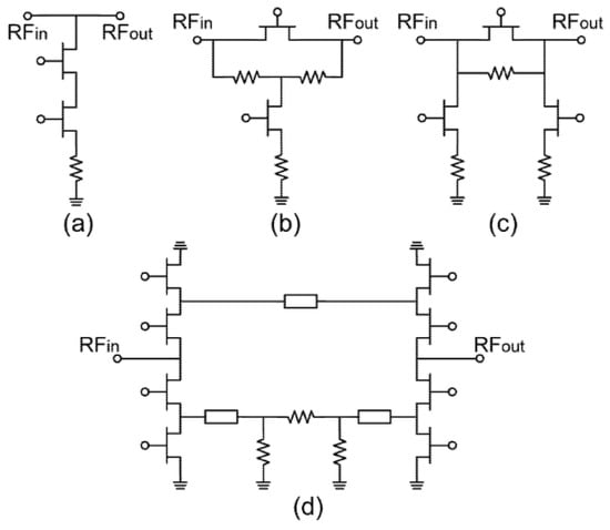 Different attenuator architectures used in the proposed design. (a) Simplified switched-T structure for 0.5 dB and 1 dB attenuation. (b) Switched-T structure for 2 dB attenuation. (c) Switched-Π structure for 4 dB and 8 dB attenuation. (d) Switched-path structure for 16 dB attenuation.