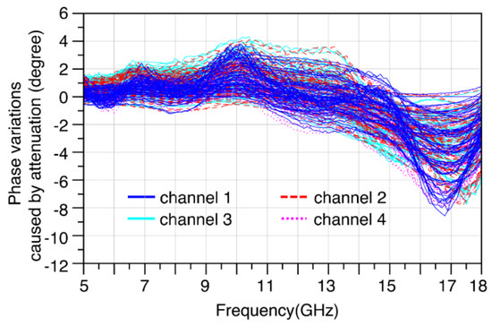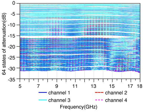 The measured attenuation characteristics across all 64 states are shown in Figure 10, which shows that the attenuation of the four channels covers 0 to 31.5 dB with a step of 0.5 dB. To evaluate the attenuation accuracy, the RMS attenuation error is calculated from the measurement results, as shown in Figure 11. This shows that the RMS attenuation error remains below 0.5 dB across the 5–18 GHz frequency range, demonstrating high precision. The phase variation caused by the attenuation states is presented in Figure 12, which shows that the phase variations are within ±8° across the entire 5–18 GHz band.