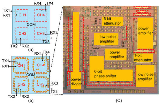 To address these constraints, RF multifunctional chips have been evolving toward a higher integration density, aiming to achieve precise amplitude and phase control, low noise, and high output power, thereby enabling accurate beamforming in phased-array systems [3]. However, achieving a broadband operation such as 5–18 GHz across multiple transceiver channels within a compact, highly integrated platform remains a significant technical challenge [4]. This frequency range is particularly critical, as it encompasses several key radar and communication bands, enabling a single system to support multifunctional capabilities. Moreover, wideband operation enhances system performance by improving resolution, target discrimination, and spectral efficiency. Further, considerable efforts have been devoted to the development of multifunctional transceiver chips for phased-array systems. Early implementations primarily focused on integrating phase and amplitude control functions to enable basic beamforming capabilities [5,6]. Subsequent advances incorporated low-noise amplifiers and power amplifiers into the same module, thereby enhancing the chip’s reception sensitivity and ability to transmit power [4]. To further increase their spatial resolution and array scalability, several works have explored multi-channel integration, typically of up to two or four RF channels [7,8].