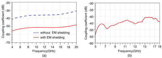 To characterize the isolation enhancement of the shielding cavities, the effect of two parallel microstrip lines with a gap of 235 μm was calculated using electromagnetic simulation software. The simulated coupling coefficient, with and without the shielding cavities, is shown in Figure 15a, where the blue dashed line represents the case without shielding cavities and the red solid line represents the case with shielding cavities. It can be seen that the isolation has been improved by about 16 dB. Further, the measured coupling coefficient between two adjacent RF channels on the multifunction chip is shown in Figure 15b, which demonstrates that the isolation exceeds 41 dB, confirming the effectiveness of the proposed shielding cavity design in mitigating inter-channel interference.