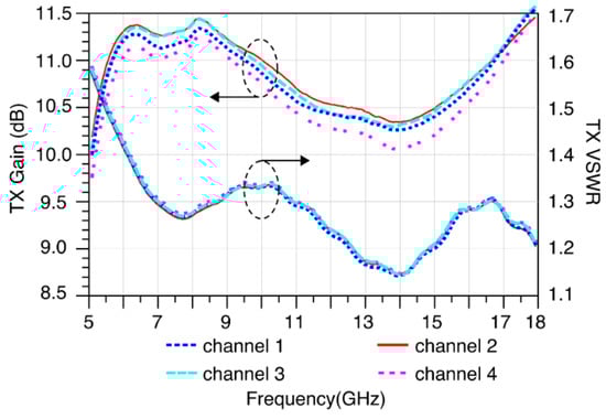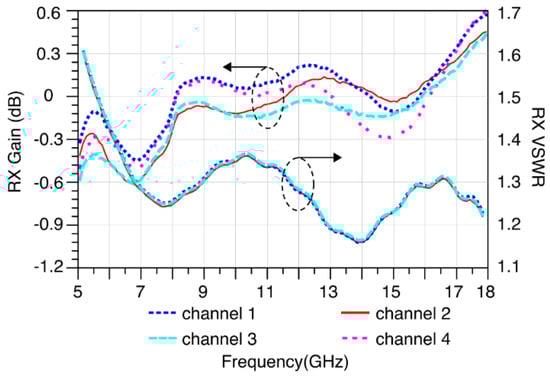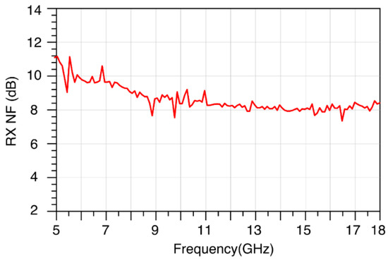 Figure 17 depicts the measured small-signal gain and VSWR of the four reception channels. It can be observed that the typical value of the receiving gains is greater than 0 dB with a good gain flatness of ±0.6 dB. The VSWR of the reception channels are lower than 1.6. Figure 18 depicts the measured noise figure (NF) of one reception channel, which shows that the NF is lower than 11 dB in the working frequency band. The reception channel exhibits a NF below 11 dB, which is relatively high for sensitive applications such as radar or communication systems, where a lower NF is often desired. It is important to clarify that in practical phased-array radar and communication systems, the proposed multifunctional RF chip would not typically be deployed as the first stage of the front-end receiver. Instead, it is preceded by an external LNA and limiter, which provide front-end protection and establish the dominant contribution to the overall system’s noise figure. Hence, the noise contribution of the multifunctional chip is significantly suppressed across the whole receiving chain according to the formula used for the cascaded noise figure.