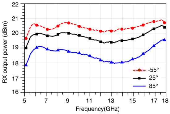 Figure 19 depicts the measured small-signal gains and VSWR of the transmission channels. It can be seen that in their transmitting state, the typical value of the transmission gain is greater than 10 dB, with a VSWR lower than 1.6. Figure 20 depicts the measured output power of the transmission channel under different ambient temperatures. The proposed chip demonstrates a 1 dB compression point (P1dB) exceeding 19 dBm at 25 °C, with the output power remaining above 20 dBm at –55 °C and above 18 dBm at 85 °C. These results confirm that the transmitter maintains a stable performance and linearity across a wide temperature range, demonstrating a robustness suitable for various environmental conditions.