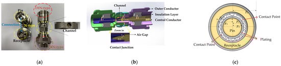The contact junction consists of a pair of N-DIN coaxial connectors with a pin and a receptacle, respectively. The receptacle of the coaxial connector is designed with a uniform six-part structure, which can effectively improve its opening degree and increase the contact area of the contact junction. It should be noted that the outer surface of the contact junction displays an air gap, as shown in Figure 1b. The schematic diagram of the cross-section of the central conductor contact junction of the coaxial connector is shown in Figure 1c, in which the contact area of the pin and the receptacle is highlighted.