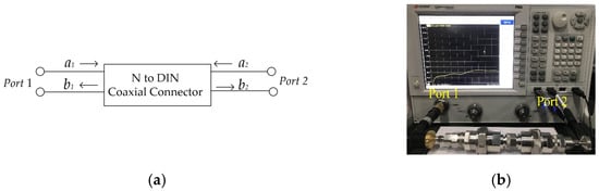 An Agilent vector network analyzer E5071C was used to measure the S parameters of the N-DIN connector. As a two-port network, the ratio of forward to reflected waves in the coaxial connector can be represented by the S parameters, as shown in Figure 2a. The relationship between the reflected and incident power waves is described as