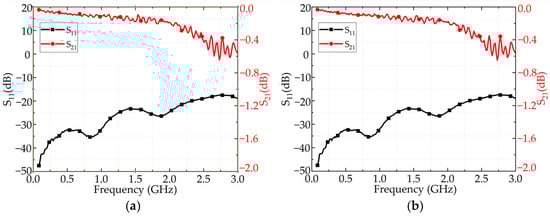 Port 1 was selected as the energy input port and Port 2 was selected as the energy output port, respectively. S11 represents the voltage reflection coefficient at Port 1, S21 represents the forward voltage gain, S12 represents the reverse voltage gain, and S22 represents the voltage reflection coefficient at Port 2. The measurement frequency range is from 100 MHz to 3 GHz, as shown in Figure 2b.