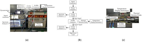 In order to measure the dissipated power and temperature data of the samples, a high-frequency and high-power RF experimental platform was designed and assembled, as shown in Figure 4. The experimental platform comprises a signal amplification system, a connector power consumption measurement system, and a thermal resistance temperature monitoring device.