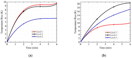 The results presented in Figure 5a demonstrate a clear temperature rise of the central conductor under high-power conditions. The silver-plated connectors across the three thickness levels exhibited similar temperature evolution trends: the temperature increased rapidly within the first two minutes, rose more gradually between two and four minutes, and stabilized after approximately four to six minutes. The plating thickness had a pronounced effect on the magnitude of the temperature rise. Specifically, the maximum temperature rise at thickness level 1 was nearly twice that observed at level 3, indicating that increasing the silver plating’s thickness effectively mitigates heat generation in the N-DIN connector under high-power input. A negative correlation was observed between the silver plating’s thickness and the temperature rise of the central conductor. As seen in Figure 5b, the nickel-plated central conductor had a similar temperature trend to the silver-plated central conductor. In addition, the temperature of the nickel-plated central conductor rose sharply. Notably, the maximum steady-state temperature of plating thickness level 2 was higher than that of plating thickness level 1.