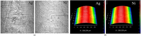 where A is the visual contact area of the N-DIN connector and can be measured by SEM analysis and h(x,y) is the height of the surface. It is noteworthy that the visual contact area of N-DIN connector samples with different thicknesses and materials exhibits a value of approximately 0.08 mm2. Three areas, each measuring 336.239 μm × 336.239 μm, were selected at equal intervals along the surface of the pin for roughness measurement. The measurement results show that the Sa values of the silver-plated samples range from 0.174 μm to 0.194 μm, and the Sq values range from 0.225 μm to 0.244 μm. For the nickel-plated samples, the Sa values range from 0.151 μm to 0.161 μm, and the Sq values range from 0.201 μm to 0.217 μm, respectively. For a given plating material, varying the thickness exhibited minimal influence on surface roughness, indicating that the size of surface asperities primarily depends on the electroplating process. Under the same thickness level, the nickel-plated surfaces exhibited lower average height and smoother morphology compared to the silver-plated surfaces. The average widths of the micro asperities were measured to be 3.63 μm for nickel plating and 3.72 μm for silver plating.