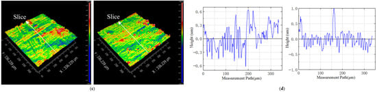 As discussed previously, the actual surfaces of the silver-plated and nickel-plated N-DIN connectors are not smooth, but rather rough and uneven, as illustrated in Figure 6a. Notably, the shape of the contact surface of the pin resembles the side of a cylinder. A three-dimensional surface model was employed to quantify the roughness morphology of the pin surface, as shown in Figure 6b,c. The height variation along a line segment of the contact surface is within 1 μm, indicating that the contact between the pin and the receptacle occurs at discrete points formed by the mechanical engagement of surface asperities. The arithmetic mean height (Sa) and root mean square height (Sq) of a surface are used as metrics to characterize the surface roughness: