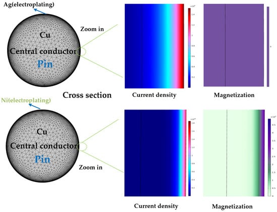 Distribution of current density and magnetization of the central conductor. (a) Current density distribution of silver plating; (b) Current density distribution of nickel plating; (c) magnetization distribution of nickel plating.