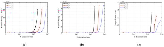 Inspection of Figure 8c reveals that, analogous to the current density distribution, the magnetization intensity is notably higher at the boundaries of the electroplated layer compared to the interior of the conductor. As the thickness of the nickel plating increases, both the growth rate and the peak value of magnetization exhibit a marked decline. This observation indicates a strong dependence of the magnetization distribution on the plating thickness, suggesting that increased thickness effectively mitigates magnetic field concentration at the contact interface.