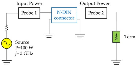 In order to calculate the theoretical dissipated power of connectors with different plating materials, a circuit simulation model was developed based on the temperature measurement circuit, as shown in Figure 9. The power input for the simulation circuit is set to 100 W with a frequency of 3 GHz. The dissipated power in the connector is calculated as the difference between probe 1 and probe 2. The S parameters of the connector samples were measured and incorporated into the simulation circuit to estimate the theoretical dissipated power. The results from the simulation, as shown in Table 3, allow a direct comparison with experimental data.