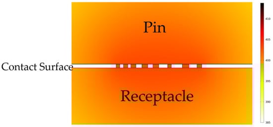 In this model, the micro asperities on the contact surface are simplified to cylinders with varying radii, which represent the interactions between the pin and the receptacle at the contact points. Based on the roughness measurement results, the average width of the cylinders in the simulation is set to 3.63 μm. The AC/DC Module and the Heat Transfer Module were used. A stationary multiphysics simulation was performed, coupling the temperature field with current flow to evaluate the steady-state temperature at individual contact spots under a DC voltage of 0.1 V. The simulation demonstrates that the highest temperature is concentrated at the contact point itself, as shown in Figure 10. Additionally, the surrounding metal temperature increases in parallel with the contact point temperature, showing only a slight difference from the peak temperature. This model highlights the localized nature of the temperature rise at the contact junction and the small thermal gradient in the surrounding material.
