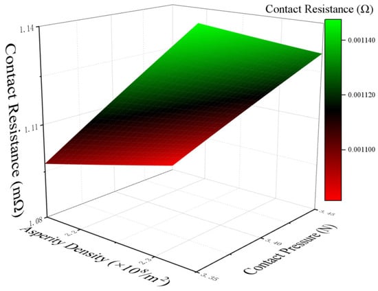 According to Equation (8), the effects of contact pressure and contact asperity density on the contact resistance are shown in Figure 11. Within the selected thickness range, the contact resistance of the silver plating shows minimal variation, remaining between 1.08 mΩ and 1.14 mΩ. In contrast, the contact resistance of the nickel plating exhibits greater variability.