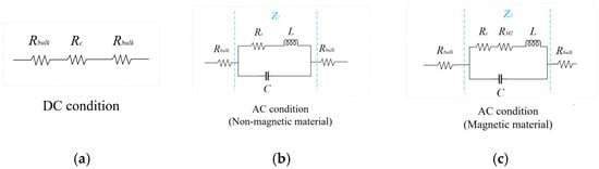 The simplified circuit of the connector is shown in Figure 12a. The bulk resistance and the constriction resistance together impede the flow of direct current (DC), and the relation can be expressed as