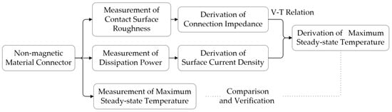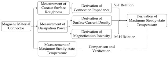 When a connector with a ferromagnetic material electroplating is subjected to a magnetic field, the charge carriers (electrons or holes) within the material experience a Lorentz force. This force alters the trajectory of the charge carriers, thereby influencing the resistance of the ferromagnetic material. High-frequency and high-power signals propagate through the connector in transverse electric and magnetic (TEM) mode. The external bias magnetic field induces magnetic resistance in the material. Both magnetic resistance and contact resistance together impede the flow of current, resulting in a voltage drop across the contact area that exceeds the voltage drop generated by the contact resistance alone. According to the voltage–temperature (V–T) relationship, the actual temperature rise in the magnetic material contact area is theoretically greater than the temperature rise predicted by considering only the contact resistance. Figure 14 illustrates the derivation and verification scheme for determining the maximum steady-state temperature of connectors with magnetic material plating.