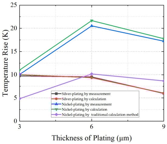 The experimental results and simulations consistently reveal distinct thermal behaviors between magnetic and non-magnetic plating materials. For non-magnetic silver coatings, increasing the plating thickness leads to improved contact quality and reduced interfacial resistance, resulting in a monotonic decrease in temperature. In contrast, ferromagnetic nickel coatings exhibit a non-monotonic temperature trend due to the combined effects of surface morphology, constriction resistance, and magnetically induced resistance variation. To account for the magnetoresistance effect in nickel coatings, a magnetic field-dependent resistance term was introduced into the equivalent circuit model, effectively capturing the hysteresis-induced nonlinearities observed in experimental data. Although slight overestimation of temperature was observed in the magnetic case, the model provides a conservative and practical margin for thermal reliability assessments.