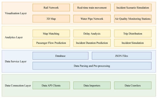 1. Data connection layer: Designed to connect to three different types of data sources, each of which is handled by a specific category of data connectors: (a) data API clients connect to the data provided by data APIs; (b) data importers import the data in common formats such as CSV, XML, and JSON; and (c) data crawlers regular scan various web pages on the internet. Data collected by API clients and crawlers mainly consist of real-time train movement and incident alert data, while those from data importers mainly consist of static data on train stations, railway tracks, and timetables.