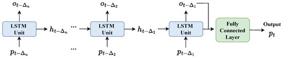 Overall, in our application we have a time series of passenger flow vectors for all stations. For each time step from the past horizon , an LSTM unit accepts the vector as input and outputs a hidden state vector and output vector of equal length. The hidden state is passed to the next unit . The last output vector is connected to the fully-connected layer in order to obtain the final result.