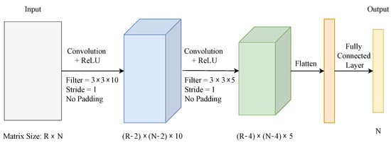 2. Convolutional Neural Networks are bio-inspired models which have been widely applied for image processing and time series prediction [39]. For our study, we construct a fully-connected CNN structure, as presented in Figure 3, which accepts as input the matrix with passenger flows as vector columns. The two-dimensional input is passed through two convolutional layers and two ReLU (rectified linear activation unit) functions, then flattened as a one-dimensional vector to be sent through a fully-connected layer which outputs the final results.